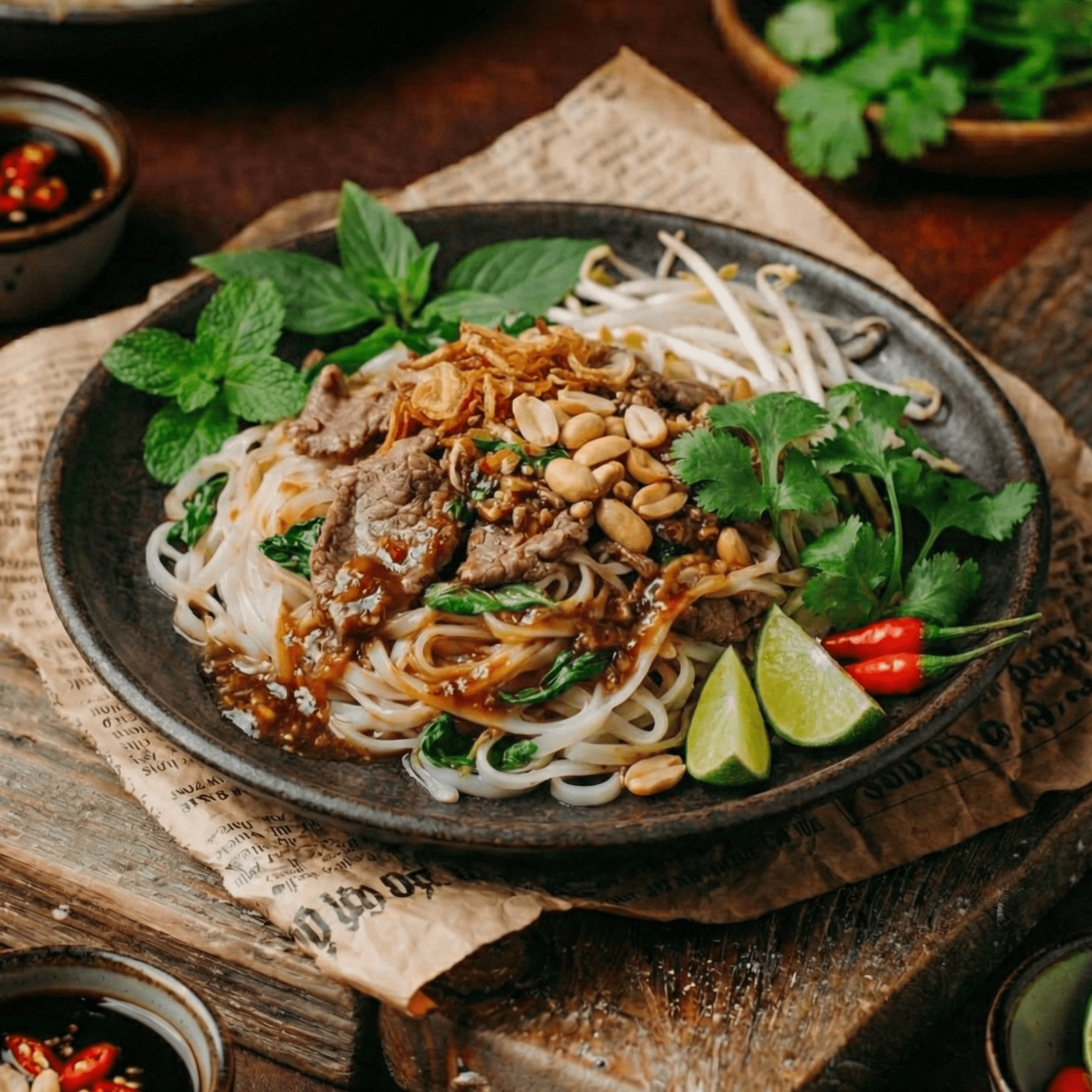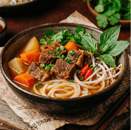 Aromatisch, leicht süßlich, würzig und duftend – eine Mischung aus vietnamesischen Gewürzen und nach französischem Eintopf-Stil: Rindfleisch, Gemüse, Galgantwurzel, Kokosmilch, dazu Reisnudeln.