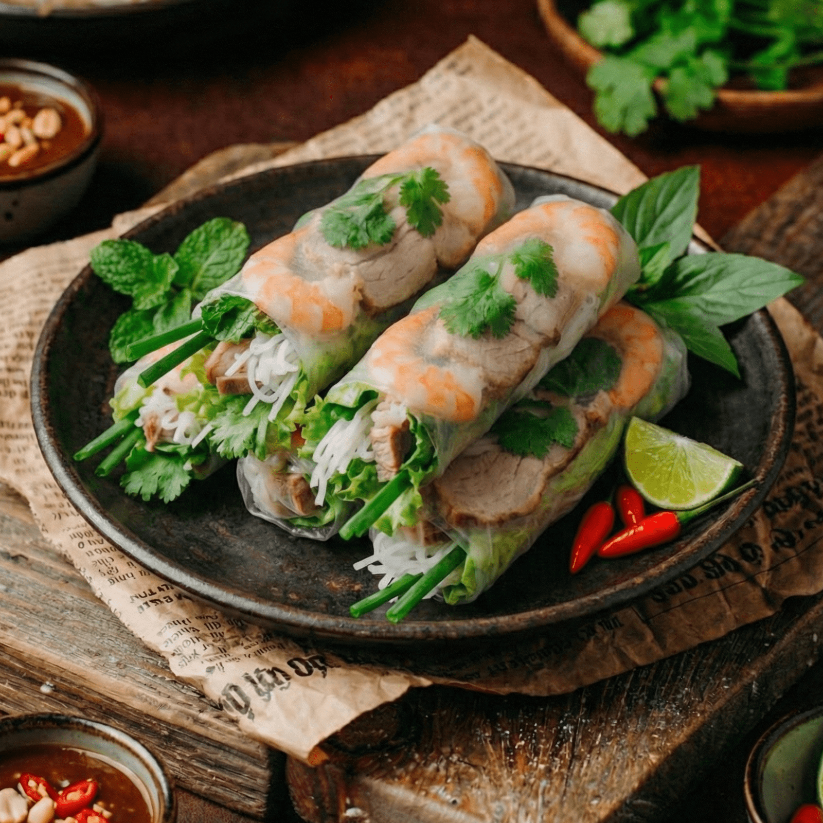 Frisch gerollte Sommerrollen und knusprig frittierte Frühlingsrollen,
